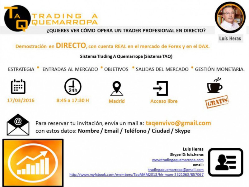 El 17 de Marzo de 2016 Trading A Quemarropa organiza el tercer TAQenVivo. De nuevo, Luis Heras, operará en directo con cuenta real en el mercado de Forex y en el DAX. Veremos cómo opera la sesión europea y americana con todos sus detalles: su estrategia, sus entradas al mercado, sus objetivos y sobre todo las Salidas del mercado y su Gestión Monetaria.