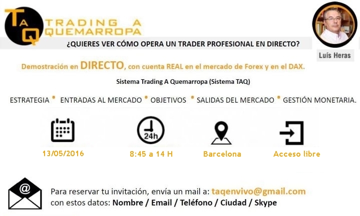 El 13 de Mayo de 2016 Trading A Quemarropa organiza el TAQenVivo4. De nuevo, Luis Heras, operará en directo con cuenta real en el mercado de Forex y en el DAX. Veremos cómo opera en la apertura de Londres con todos sus detalles, su estrategia, sus entradas al mercado, sus objetivos y sobre todo las Salidas del mercado y su Gestión Monetaria, sin olvidar el aspecto Fiscal del Trading.