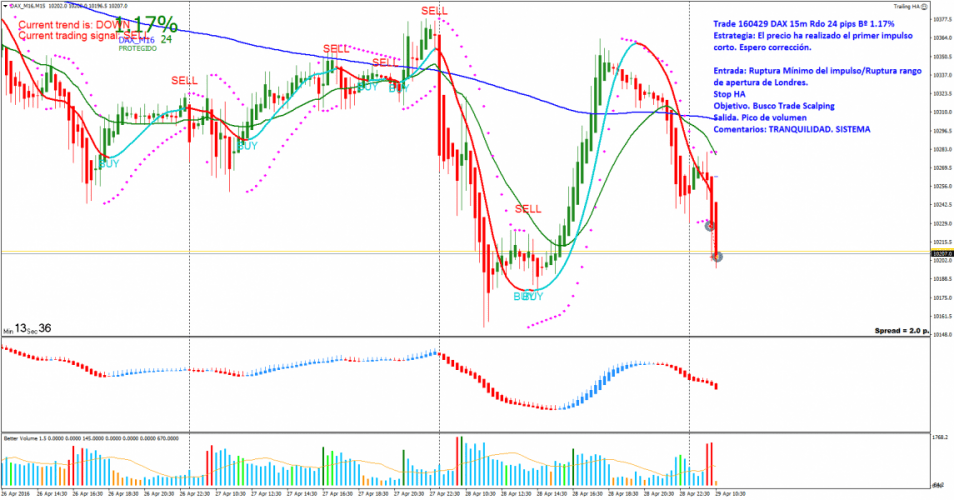 Entrada: Ruptura Mínimo del rango de la apertura de Londres. Busco un trade rápido colocando el Stop de Gestión en las HA. Me salgo del mercado en Pico de Volumen con Rdo +24 pips y un Bº 1,17%.