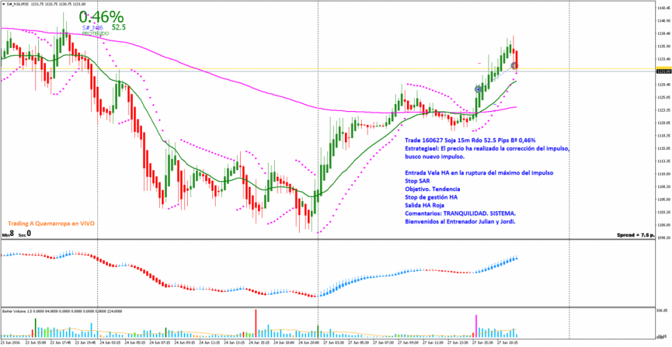 Entrada: ruptura máximo del impulso. HA tipo1. Entro al mercado buscando la tendencia. Coloco Trailing HAMA y me salgo del mercado cuando las HA cambia de color con Resultado 52.5 pips y Bº 0,46%.