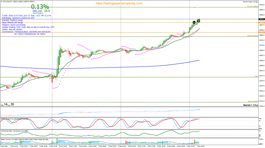 Entrada: Ruptura del máximo del rango apertura. Entro al mercado buscando un trade rápido con un objetivo mirando el Beneficio. Cuando el marcador me indica 0.30% subo stop de gestión donde finalmente me saca del mercado con un Rdo de 10,5 pips y un Bº 0,13%.