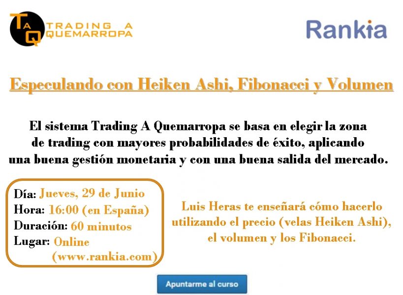 Jornadas de Trading Trading A Quemarropa en Rankia (29 de Junio de 2017) El jueves 29 de Junio a las 16 (hora española), Luis Heras volverá a participar como ponente en uno de los muchos cursos que organiza Rankia en su página web. Programación: Pincha en este enlace para apuntarte a la webinar gratuita: https://www.rankia.com/cursos/1040-especulando-heiken-ashi-volumen-fibonacci ¡Solo tienes que registrarte! Compartir: Compartir en Facebook (Se abre en una ventana nueva) Facebook Compartir en X (Se abre en una ventana nueva) X Compartir en WhatsApp (Se abre en una ventana nueva) WhatsApp Email a link to a friend (Se abre en una ventana nueva) Correo electrónico Más Compartir en Telegram (Se abre en una ventana nueva) Telegram Share on LinkedIn (Se abre en una ventana nueva) LinkedIn Share on Pinterest (Se abre en una ventana nueva) Pinterest Imprimir (Se abre en una ventana nueva) Imprimir Me gusta Cargando... Relacionado
