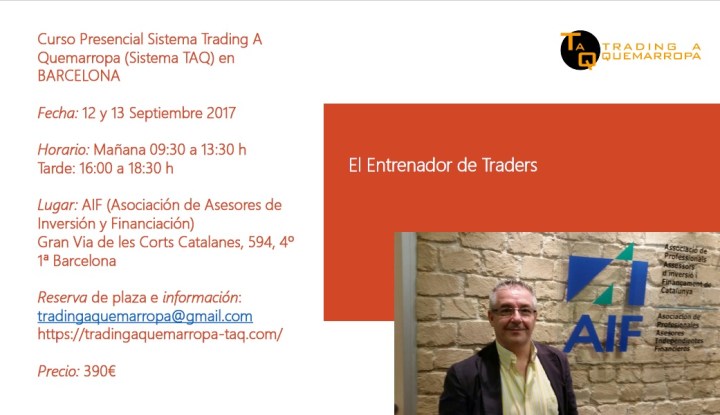 Después de las vacaciones, daré un curso presencial de nuestro Sistema Trading A Quemarropa en Barcelona. Será el 12 y 13 de septiembre del 2017 por la mañana (de 9:30 a 13:30h) y por la tarde (de 16:00 a 18:30).