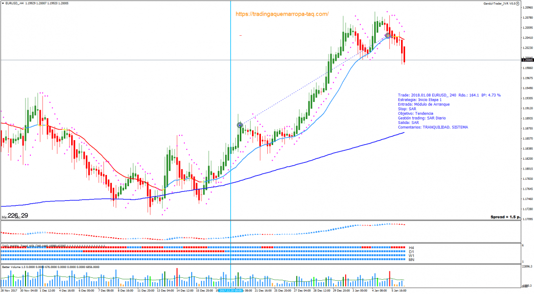 Entrada: Módulo de Arranque. El volumen de parada me confirma el Módulo de Arranque. Tendencia alcista en gráfico diario. Stop en SAR Modificado y el objetivo es seguir la nueva tendencia. Stop de Gestión con Trailing HAMA y Trailing SAR Modificado donde me salgo con Rdo +164.1 Pips y un Bº 4.73%.