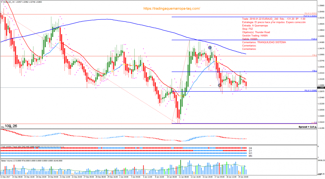 Entrada: A Quemarropa. Entro al mercado colocando Stop cerca del F62 porque considero que ya está finalizada la corrección en ABC y con idea de seguir la tendencia con la estrategia Thunder Road. Finalmente el precio sigue la corrección y me salgo cuando las Heiken Ashi Suavizadas (HAMA) cambian de color con Rdo -131.2 Pips y un Bº -1%.