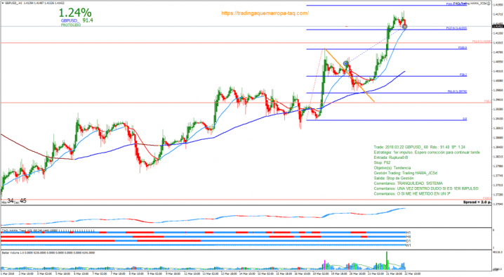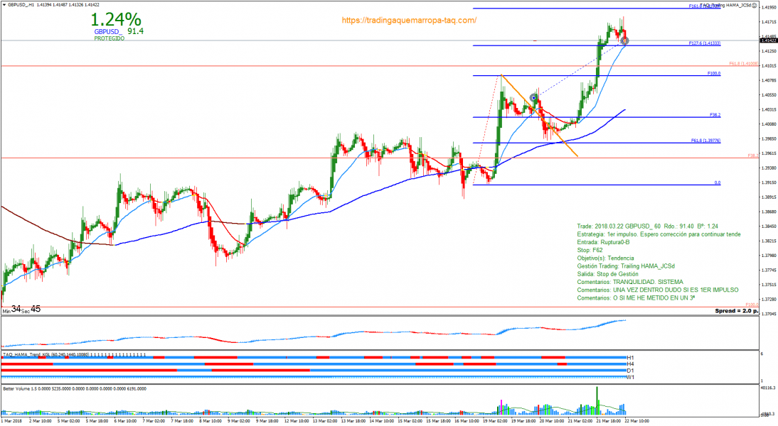 Entrada: Ruptura 0-B. Entro al mercado en la ruptura 0-B pensando que estoy en el 1er impulso. Busco la tendencia y mi objetivo es el F200. Una vez dentro, dudo si realmente es la zona de Trading adecuada o me he metido en un tercer impulso. Gestiono con nuestro EA: TAQ_Trailing HAMA_JCSd y me saca el stop de gestión con un Rdo 91.4 Pips y un Bº 1.24%.