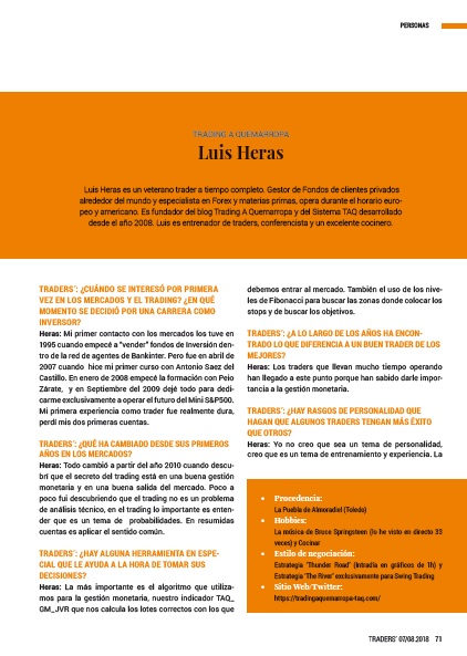 Nuevo artículo en la revista TRADERS’ del mes de Julio, esta vez es una entrevista muy interesante a Luis Heras. En ella habla de su experiencia, las cosas importantes para ser Trader, la diferencia entre ser un buen trader o el mejor y mucho más.