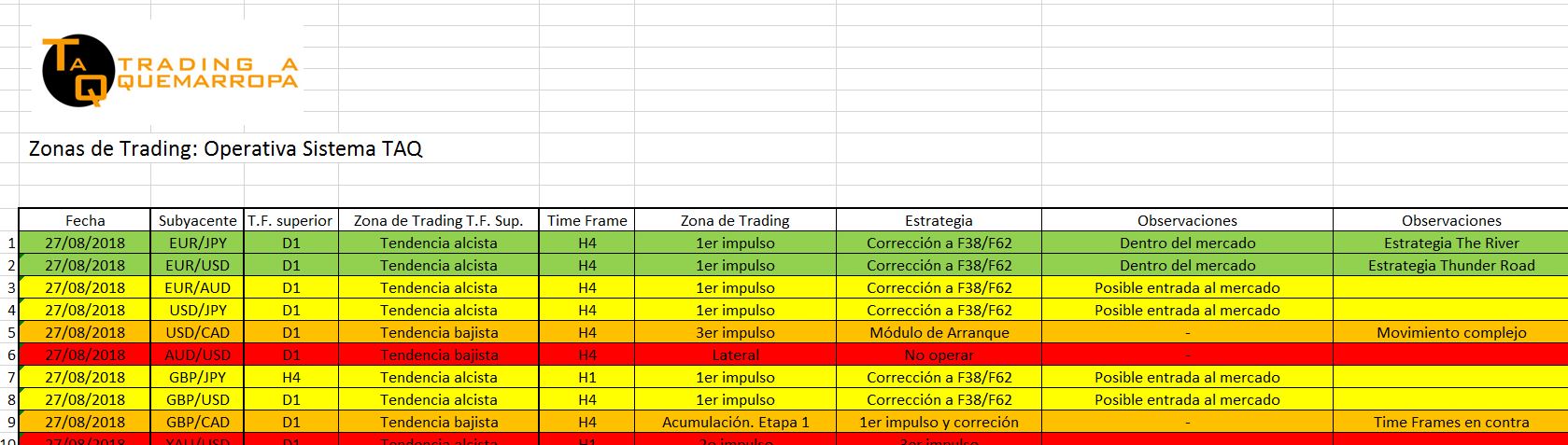 Operativa Zonas de Trading 27/08/2018 Os dejamos las zonas de trading que vemos operativas en Trading A Quemarropa. Estamos dentro del mercado en el EUR/JPY y EUR/USD en 4 horas. Para los que sigáis de vacaciones, y para los que no también, os recomiendo repasar esta lista de reproducción que tenemos en nuestro canal de Youtube con vídeos del Sistema TAQ sobre el volumen, explicación de la estrategia Thunder Road, nuestro indicador favorito… https://www.youtube.com/playlist?list=PLAbz4Rc61aBigEzv1HU-7WswhojXiehFq Compartir: Compartir en Facebook (Se abre en una ventana nueva) Facebook Compartir en X (Se abre en una ventana nueva) X Compartir en WhatsApp (Se abre en una ventana nueva) WhatsApp Email a link to a friend (Se abre en una ventana nueva) Correo electrónico Más Compartir en Telegram (Se abre en una ventana nueva) Telegram Share on LinkedIn (Se abre en una ventana nueva) LinkedIn Share on Pinterest (Se abre en una ventana nueva) Pinterest Imprimir (Se abre en una ventana nueva) Imprimir Me gusta Cargando... Relacionado