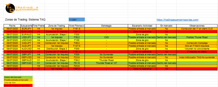 Apertura de la Semana del Lunes 06/07/2020 en la que vemos las zonas de trading operativas en el Sistema TAQ.