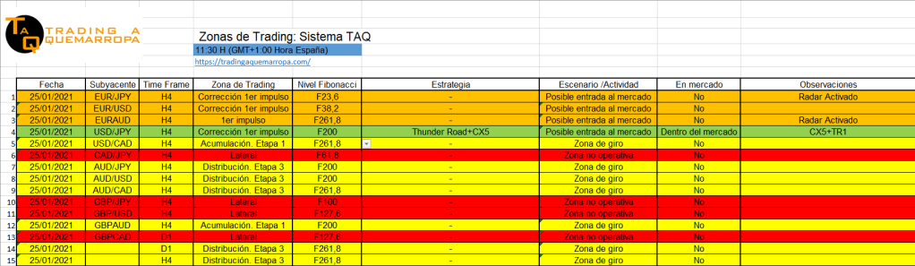 Seguimos dentro del mercado en el USD/JPY H4 siguiendo la estrategia TAQ Thunder Road+CX5. Tenemos el radar activado para que nos avise con posibles entradas en el EUR/JPY y EUR/AUD.