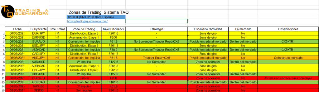Dentro del mercado: – Siguiendo la Estrategia TAQ- Thunder Road + CX5 en 4 horas: EUR/AUD y USD/CAD. – Con la Estrategia TAQ- No Surrender en 4 horas: EUR/AUD, USD/CAD, AUD/USD, GBP/USD y GBP/CAD.