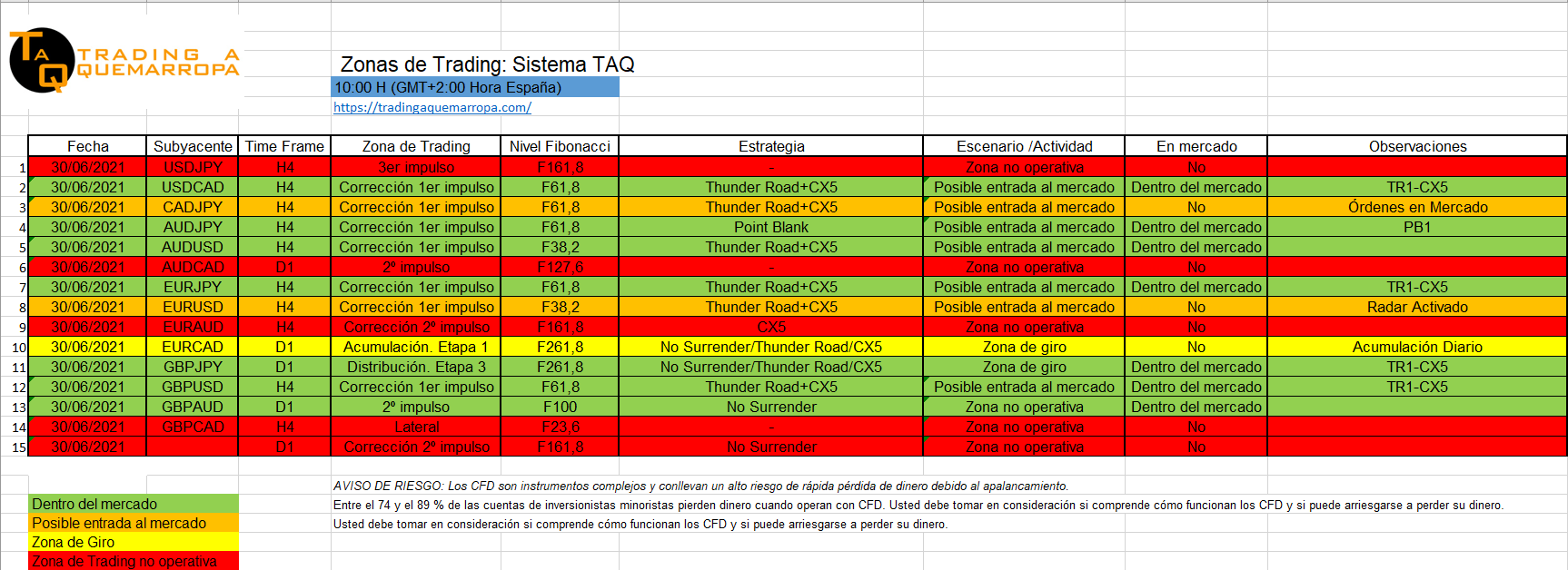 Así vemos las zonas en las que se encuentran los subyacentes con los que trabajamos en Trading A Quemarropa.