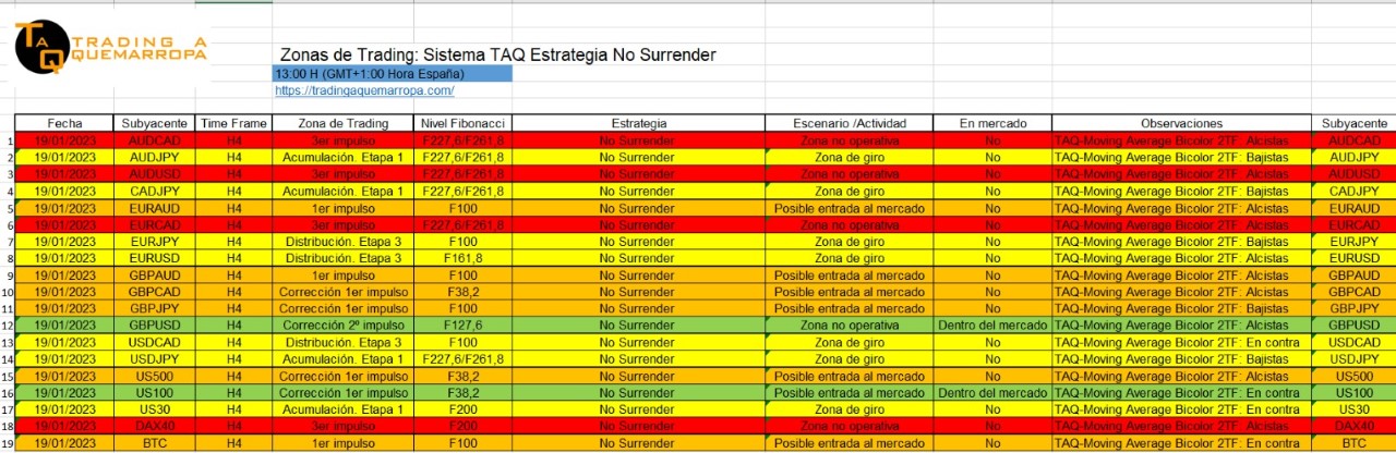 Zonas de Trading Zonas de Trading 19/01/2023: Dentro del mercado Así vemos las zonas en las que se encuentran estos pares de divisas e índices en Trading A Quemarropa. Estrategia TAQ No Surrender – Dentro del mercado en la GBP/USD y US100; Salimos del AUD/USD y USD/CAD: Estrategia TAQ CX30 – Fuera del mercado: No te pierdas la webinar de esta semana: «TAQ en VIVO 52 – 16/01/2023. Master Class Estrategia TAQ No Surrender». Un saludo, Luis Heras.Compartir: Compartir en Facebook (Se abre en una ventana nueva) Facebook Compartir en X (Se abre en una ventana nueva) X Compartir en WhatsApp (Se abre en una ventana nueva) WhatsApp Email a link to a friend (Se abre en una ventana nueva) Correo electrónico Más Compartir en Telegram (Se abre en una ventana nueva) Telegram Share on LinkedIn (Se abre en una ventana nueva) LinkedIn Share on Pinterest (Se abre en una ventana nueva) Pinterest Imprimir (Se abre en una ventana nueva) Imprimir Me gusta Cargando... Relacionado