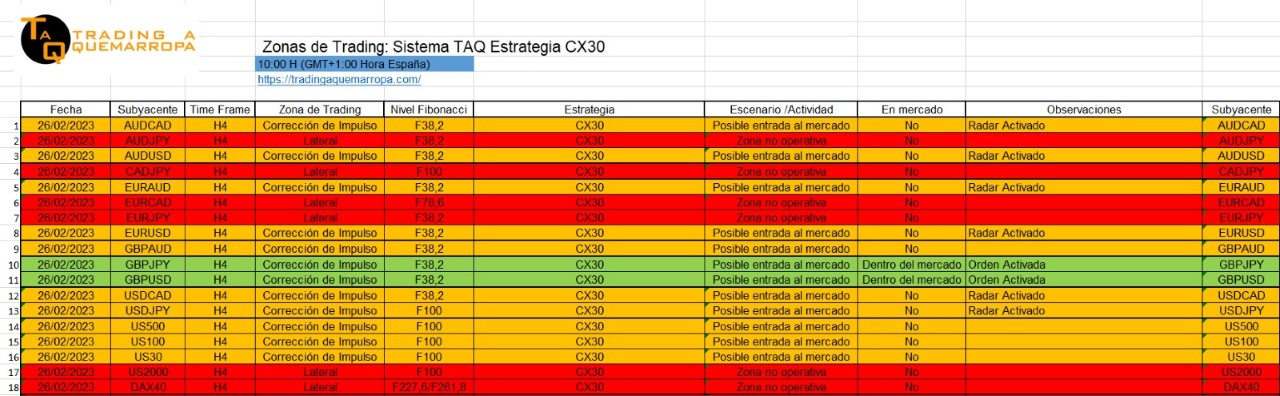 Estrategia TAQ CX30: Dentro del mercado y 6 pares en vigilancia con el radar activado.