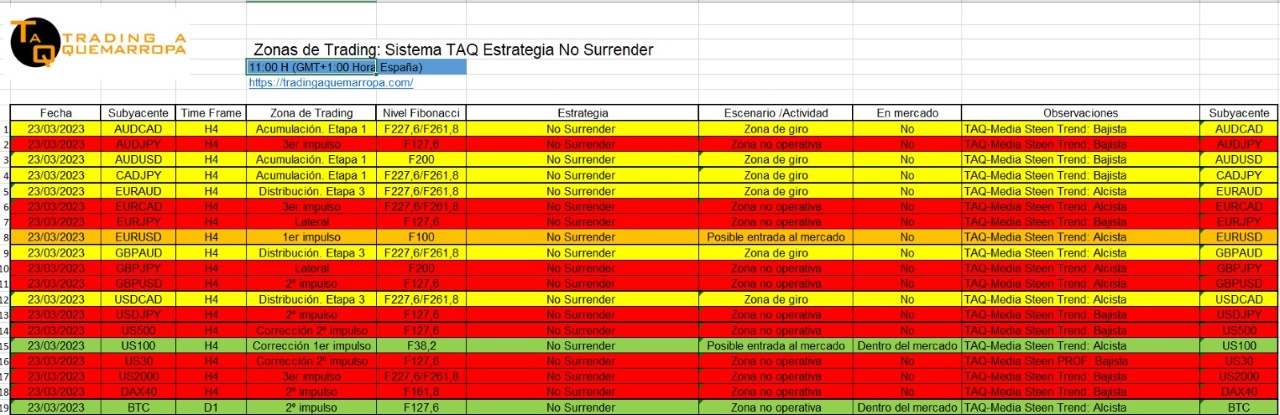 Estrategia TAQ No Surrender: Seguimos dentro del mercado en el Nasdaq100 y en BTC (gráfico diario). Posibles zonas de giro en gráficos de 4 horas en el AUD/CAD, AUD/USD, CAD/JPY, EUR/AUD, GBP/AUD y USD/CAD.