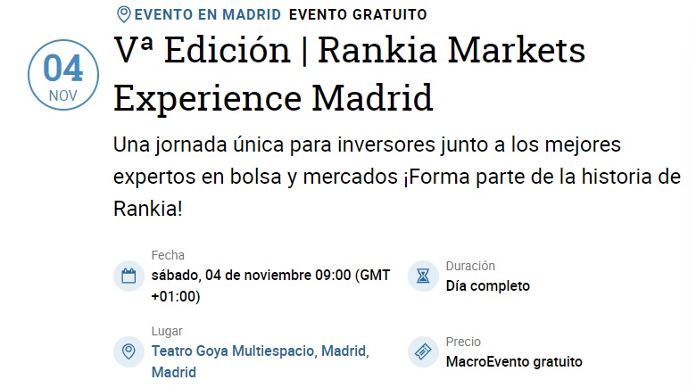 Rankia nos ha invitado a la Vª Edición de Rankia Markets Experience para dar una ponencia presencial en Madrid. El evento será el próximo 4 de noviembre en el Teatro Goya Multiespacio, pero también se podrá seguir online.