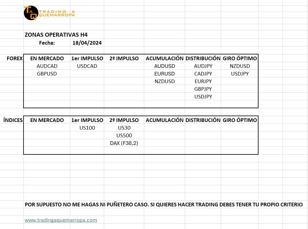 Zonas de Trading Zonas de Trading 18/04/2024 Así vemos en Trading A Quemarropa las Zonas de Trading en las que se encuentran estos pares de divisas e índices: Las entradas que tenemos dentro del mercado, las podrás ver en el vídeo de la Webinar del lunes, que ya está subido a nuestro canal de Youtube: TAQ en VIVO 14 – 15/04/2024. Reto Thunder Road: En mercado AUDCAD y GBPUSD Un saludo, Luis Heras.Compartir: Compartir en Facebook (Se abre en una ventana nueva) Facebook Compartir en X (Se abre en una ventana nueva) X Compartir en WhatsApp (Se abre en una ventana nueva) WhatsApp Email a link to a friend (Se abre en una ventana nueva) Correo electrónico Más Compartir en Telegram (Se abre en una ventana nueva) Telegram Share on LinkedIn (Se abre en una ventana nueva) LinkedIn Share on Pinterest (Se abre en una ventana nueva) Pinterest Imprimir (Se abre en una ventana nueva) Imprimir Me gusta Cargando... Relacionado