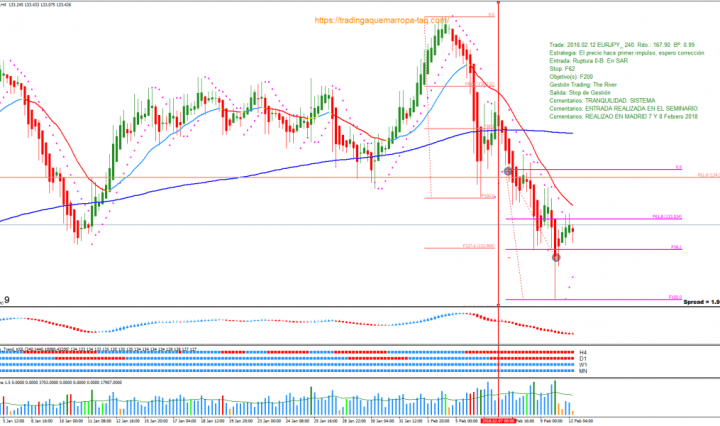 Estrategia: El precio hace un primer impulso bajista, Corrección ABC. Busco 2º Impulso. Entrada: Ruptura 0-B. Entro al mercado el día 07/02/18 colocando la orden de entrada en el Parabolic SAR después de la ruptura O-B. Coloco Stop en F62 … Continúa leyendo 180209 EUR/JPY 4H TAQ. ENTRADA EN DIRECTO EN EL SEMINARIO THUNDER ROAD EN MADRID
