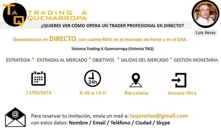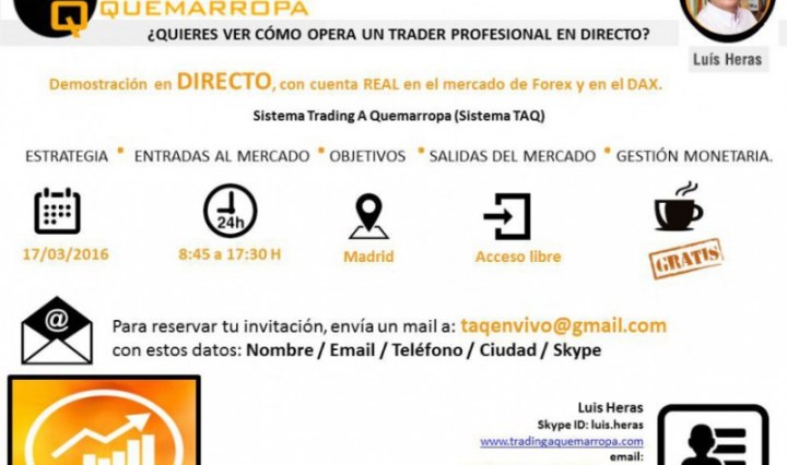 Trading A Quemarropa te invita a una nueva jornada de Trading en directo con Luis Heras. En nuestro TAQenVIVO5, pasaremos nueve horas operando la sesión Europea y la apertura Americana con nuestra cuenta en real. Luis Heras es un veterano … Continúa leyendo Trading A Quemarropa te invita a una nueva jornada de Trading el 16 de junio