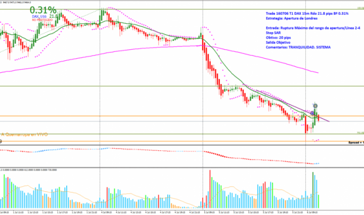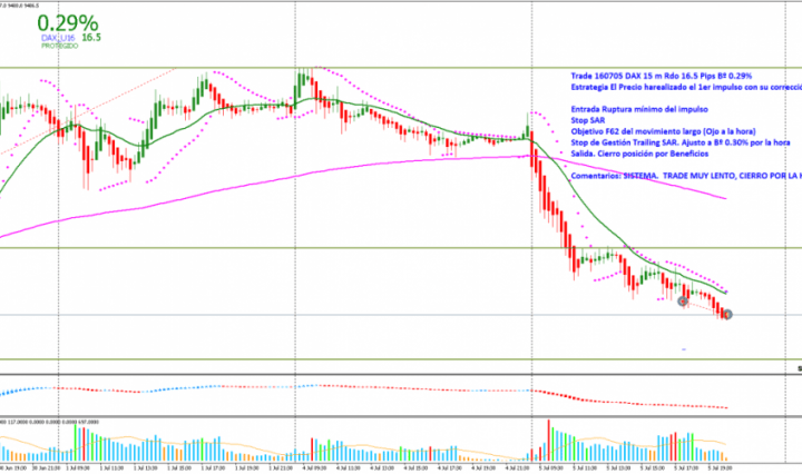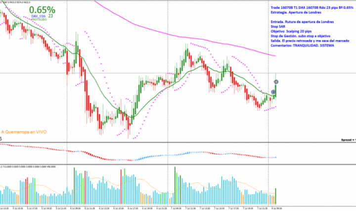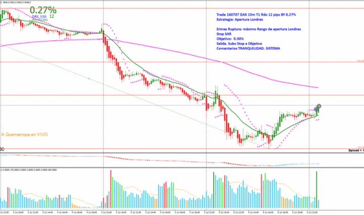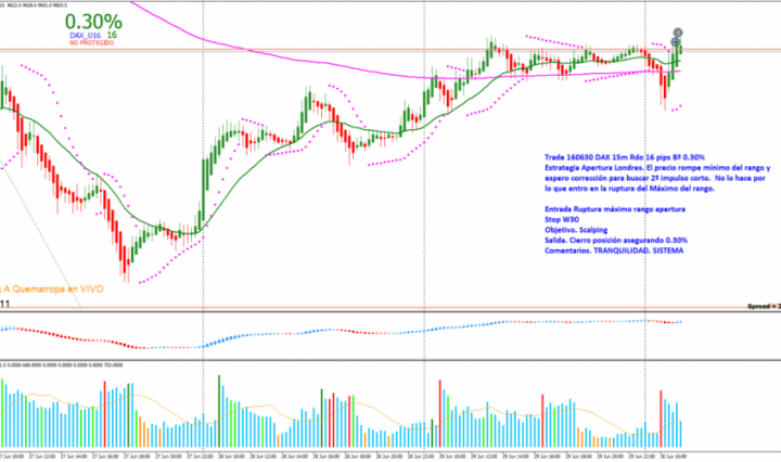 TRADE 1: DAX 15m TRADING A QUEMARROPA Estrategia: Apertura de Londres. Entrada: Ruptura del máximo del rango apertura. Entro al mercado buscando un trade rápido con un objetivo mirando el Beneficio. Cuando el marcador me indica 0.30% subo stop de … Continúa leyendo 161207 Operativa 15 Min TRADING A QUEMARROPA